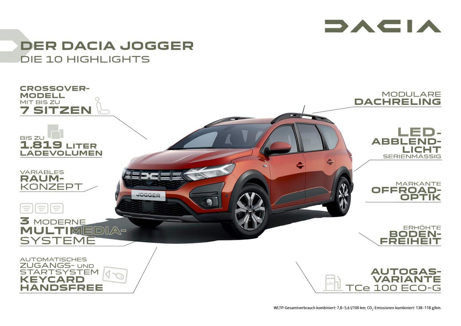 Dacia Jogger ECO-G 100 5-Sitzer: Gesamtverbrauch kombiniert (l/100 km): 7,7 (6,0); CO2-Emission kombiniert (g/km): 118 (135); CO2-Klasse: D (D).