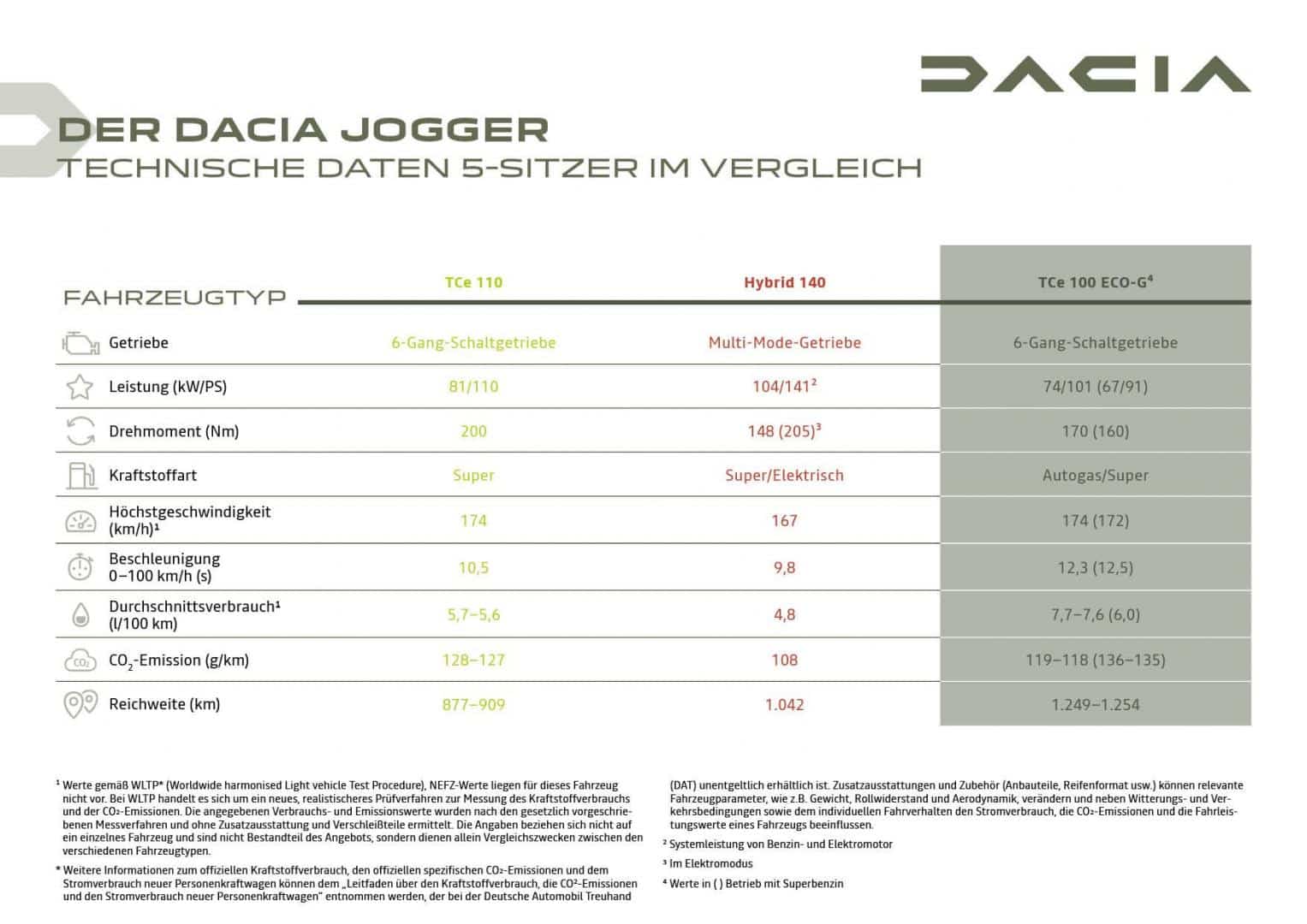 Dacia Jogger HYBRID 140 5-Sitzer: Gesamtverbrauch kombiniert (l/100 km): 4,7; CO2-Emission kombiniert (g/km): 105; CO2-Klasse: C.