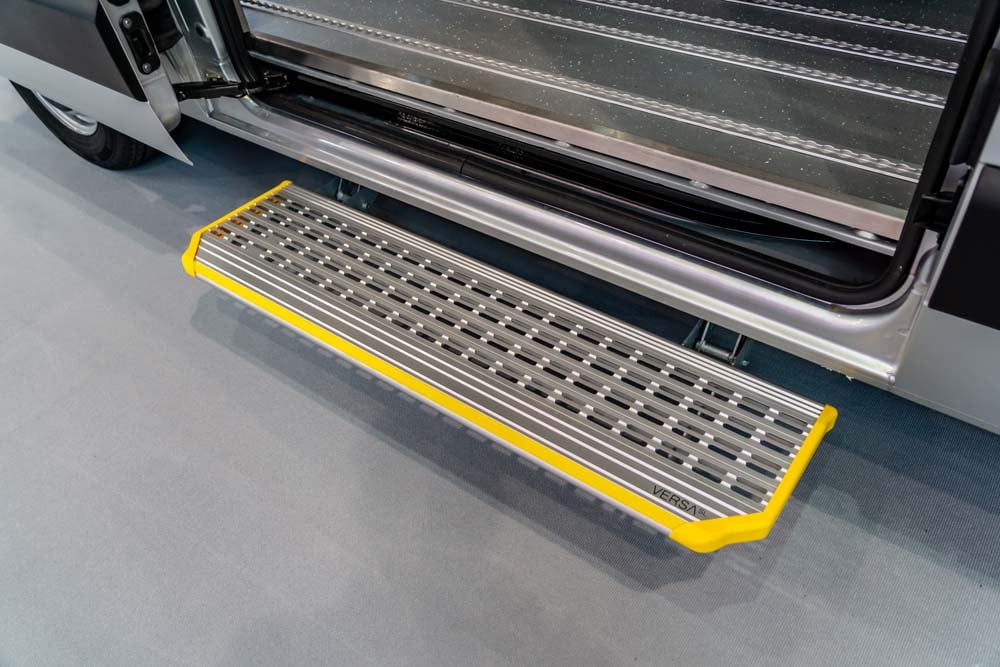 Das Bedienkonzept der Rollstuhlsicherung von EVS erleichtert den Alltag, denn das innovative Retraktoren-Spannsystem wird mechanisch per Fuß entriegelt und gesichert. Alle Gurte der Rollstuhl-Rückhaltesysteme sind im Boden des Renault Fahrzeugs versenkt und verbleiben hier bei Nichtgebrauch. Bei diesem System ist das Handling und Spannen einzelner Retraktoren nicht mehr nötig.