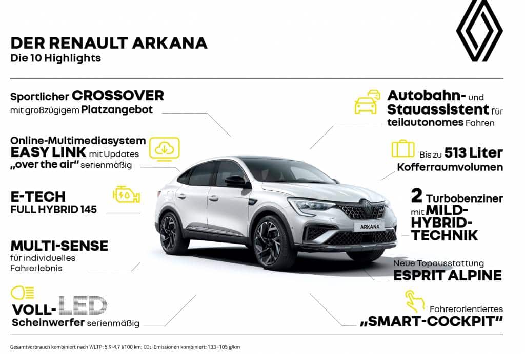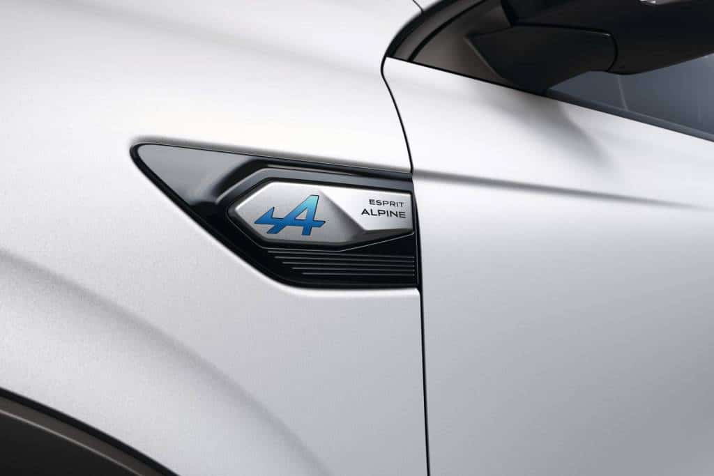 ersetzt die Version R.S.. Kennzeichen ist das Luftleitelement in Satin-Grau in der Frontschürze. Hinzu kommen Plaketten an den vorderen Kotflügeln mit dem unverwechselbaren „A“ für Alpine. Neu designte 19-Zoll-Leichtmetallräder „Esprit Alpine“ verleihen dem Wagen ein ebenso edles wie sportliches Aussehen. Die Sitze sind mit einer Mischung aus biobasierten Fasern und Einsätzen in Wildleder-Imitat bezogen. Blaue Steppnähte und das in die Rückenlehne eingearbeitete Alpine Logo runden das sportliche Erscheinungsbild ab. Blaue Streifen finden sich auch an den Sicherheitsgurten. Die Türverkleidungen und das Lenkrad sind entsprechend den Farben der französischen Trikolore mit rot-weiß-blauen Nähten versehen, während der Instrumententräger auf der Beifahrerseite mit Schieferdekor verziert ist. Serienmäßige Komfortelemente für den Arkana Esprit Alpine sind das beheizbare Lenkrad, die Sitzheizung vorn sowie die elektrische Höhenverstellung für die Vordersitze inklusive Lordosenstütze auf der Fahrerseite. Hinzu kommen der Adaptive Tempopilot, der Autobahn- und Stauassistent sowie der Easy-Park-Assistent.
