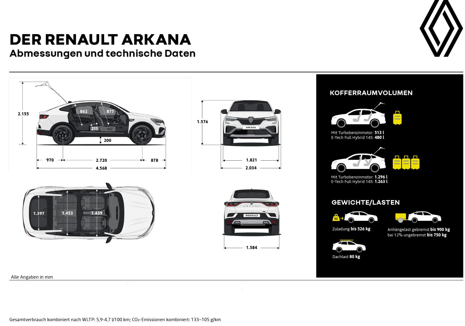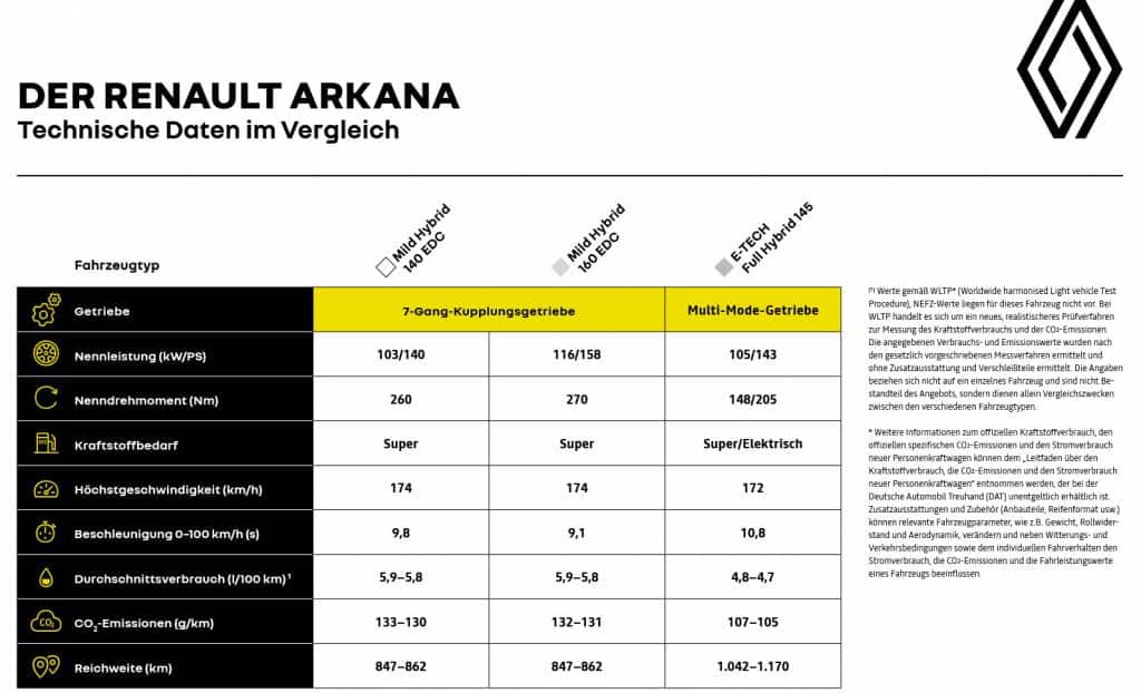 Renault Arkana Mild Hybrid 160 EDC: Gesamtverbrauch kombiniert (l/100 km): 6; CO2-Emission kombiniert (g/km): 135; CO2-Klasse: D.