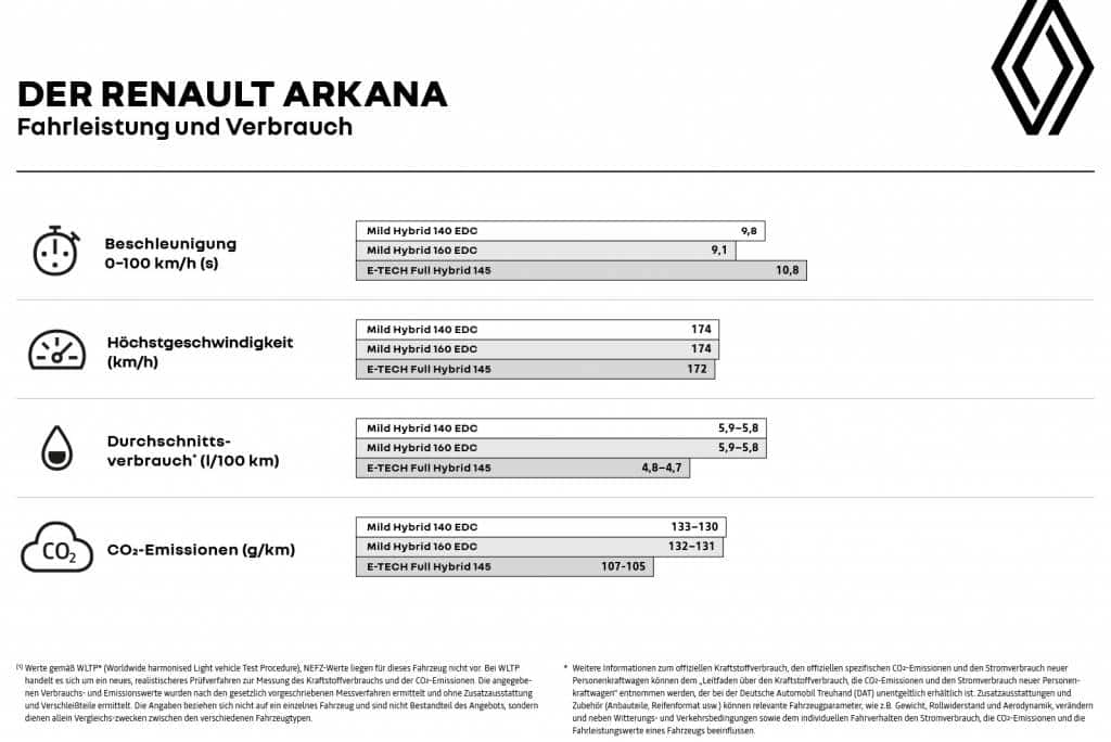 Renault Arkana E-Tech Full Hybrid 145: Gesamtverbrauch kombiniert (l/100 km): 4,9; CO2-Emission kombiniert (g/km): 110; CO2-Klasse: C.