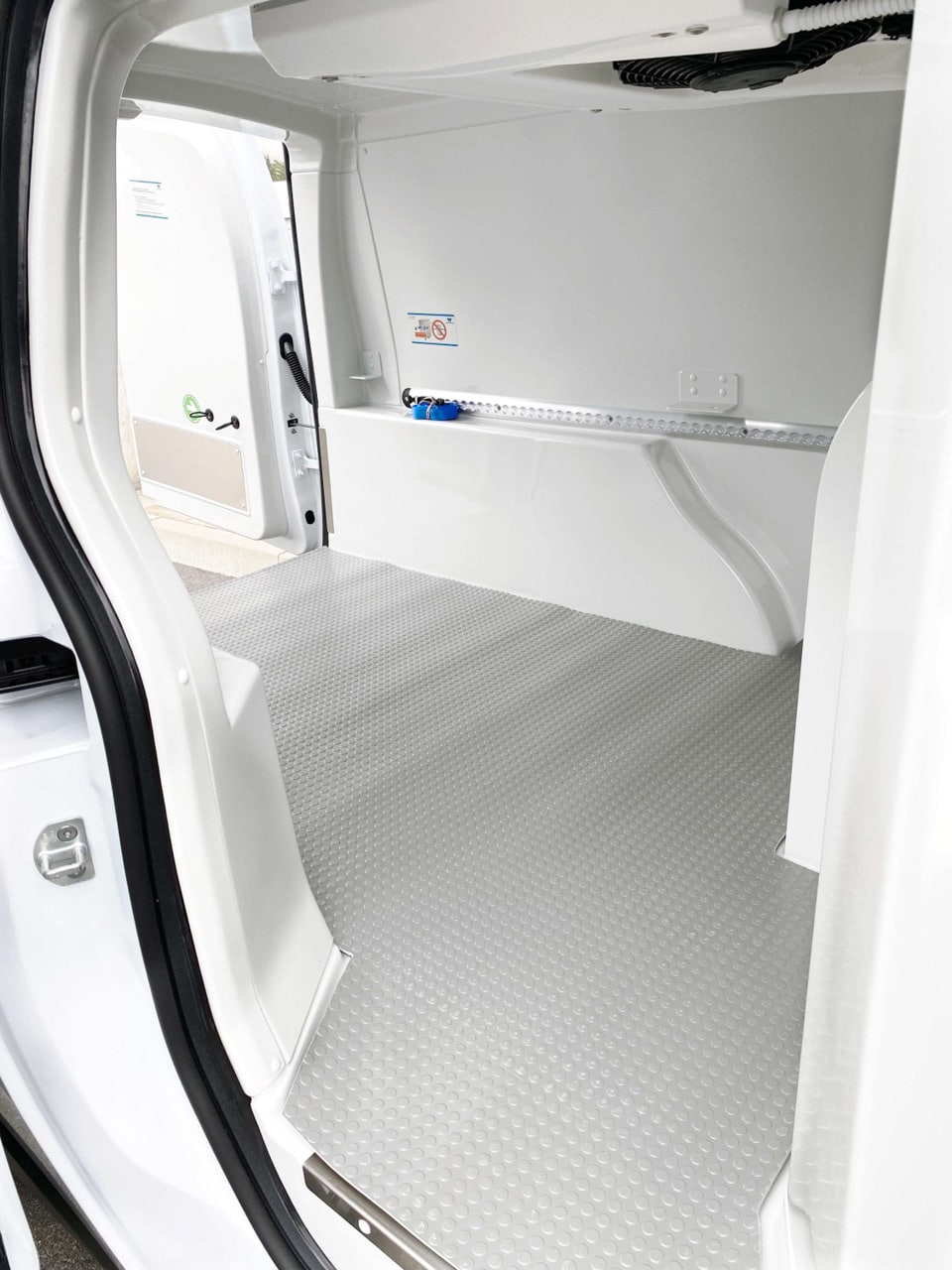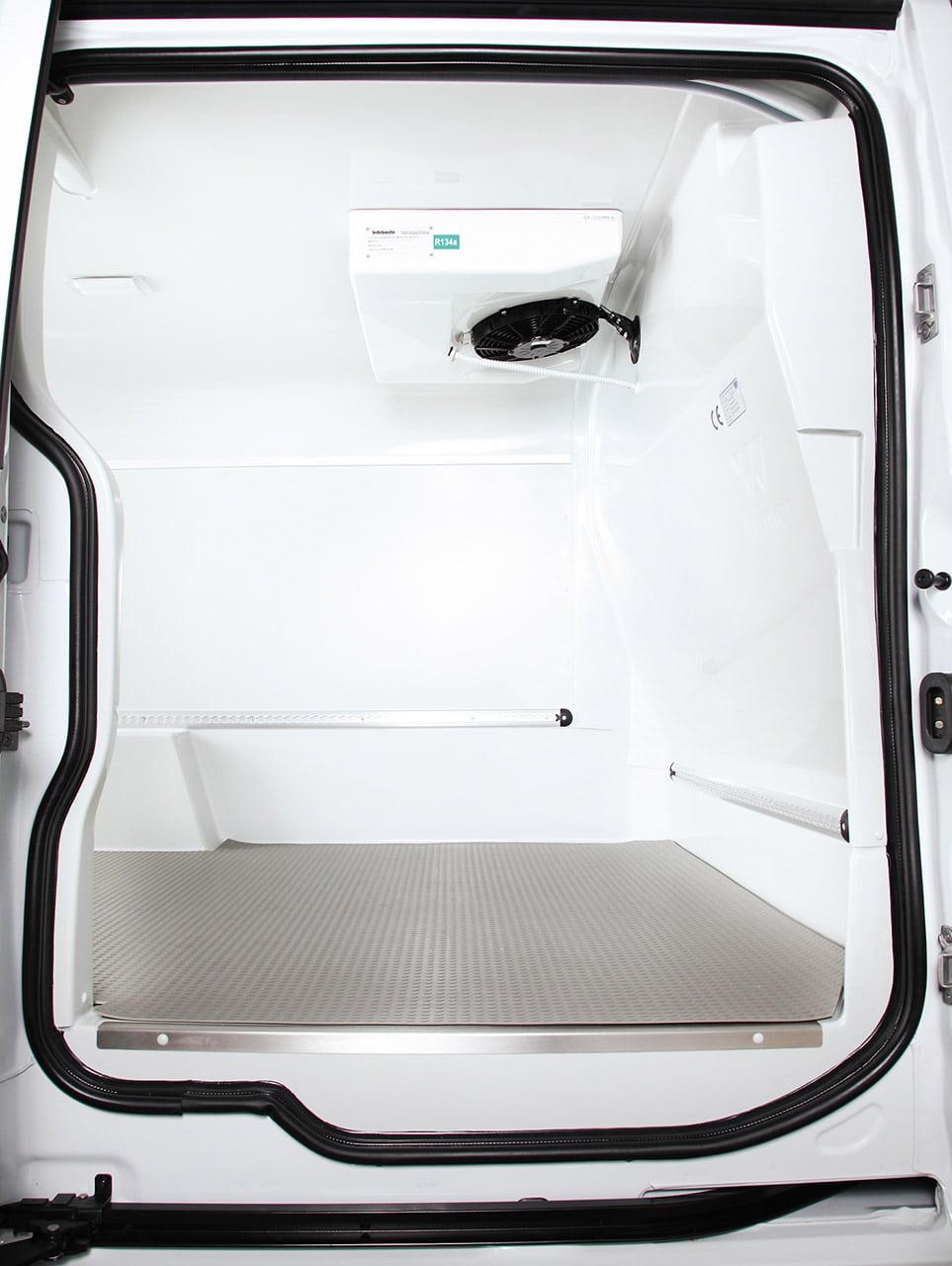 Die Kombination einer leistungsstarken und neu entwickelten integrierten Kühlanlage ohne Dachaufbau mit einer hochwertigen GFK Laderaumverkleidung und wirkungsvoller Dämmung nach ATP- und HACCP Norm im TC.VAN® Ausbau mit Kühl- und Heizfunktion sorgt für einen sicheren Transport aller Lebensmittel, wie z.B. Fleisch- und Wurstwaren oder Fisch.